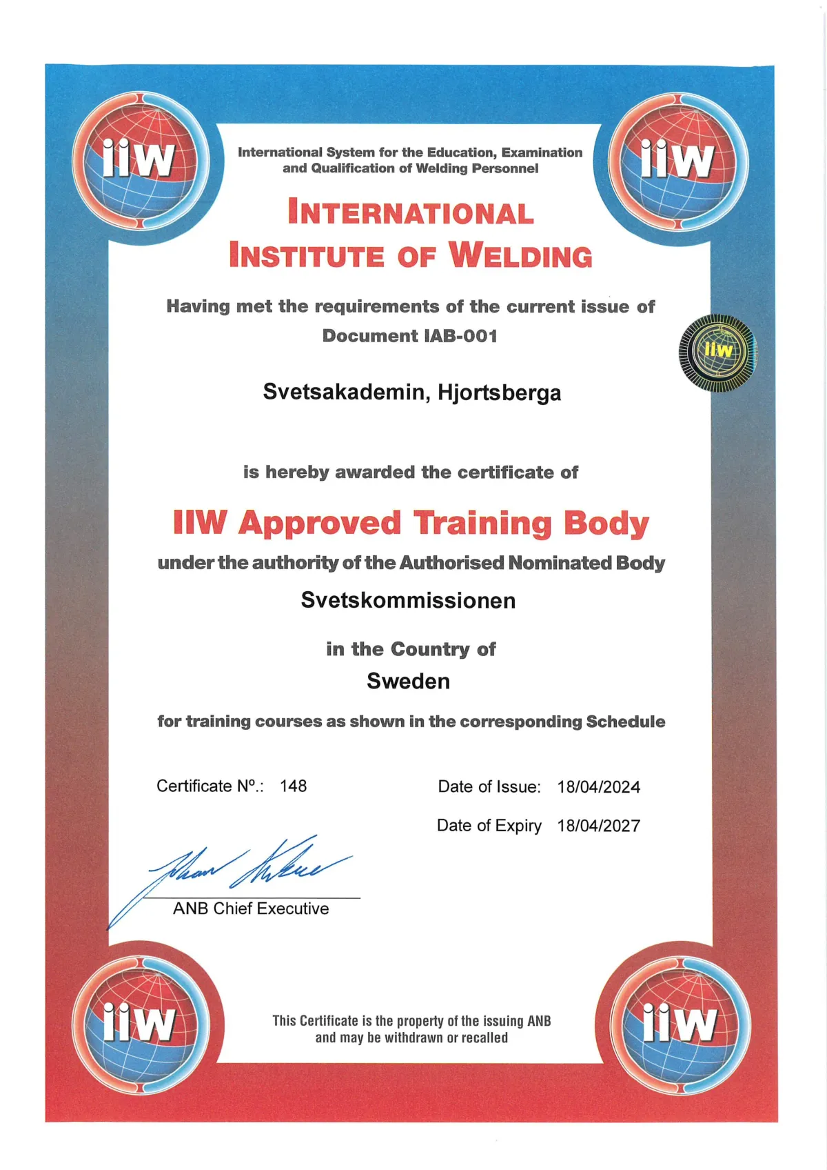 Internationellt godkänd utbildning för att klara kraven som svetsansvarig/svetskoordinator enligt IIW:s (International Institute of Welding) riktlinjer.